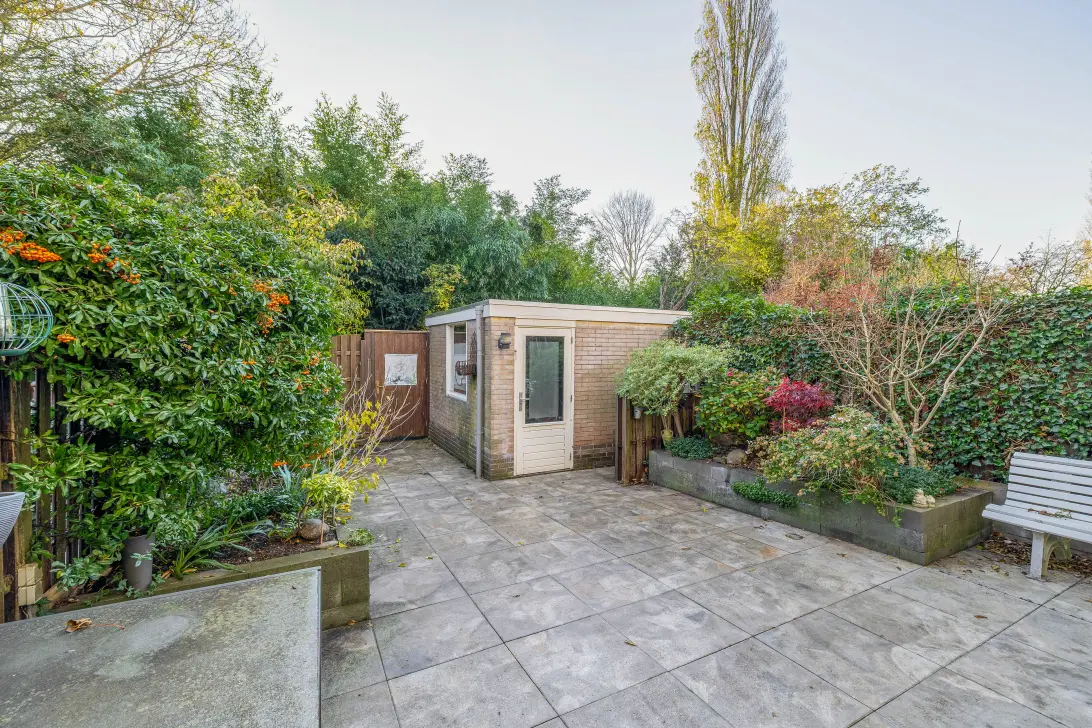 Ga je via de schuifpui, of via de keukendeur naar de achtertuin? Met een ligging op het zuidwesten is dit een heerlijke tuin voor de zonliefhebber. Grote tegels maken de tuin optisch groter en ook hier zie je verhoogde borders met mooie beplanting. In de stenen berging is ruimte voor de fietsen en er is een poort naar de steeg. Over de hele breedte van de achtergevel hangt een elektrisch bedienbaar zonnescherm, voor verkoeling op het terras en schaduw in huis.