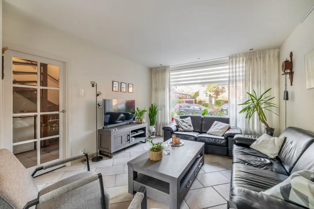 De lichte woonkamer staat in open verbinding met de keuken, wat het gevoel van ruimte sterk vergroot. Het zitgedeelte is aan de voorzijde, met uitzicht naar de voortuin en de rustige straat. Als je op de bank of een van de fauteuils zit, zie je dat er bewust is gekozen om de planten in verhoogde borders te plaatsen.