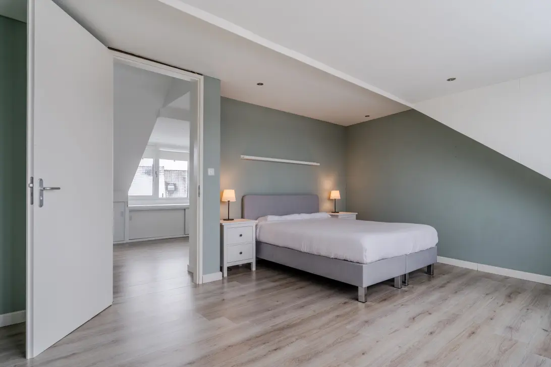 De slaapkamer is heerlijk ruim en licht dankzij de dakkapel. De kamer is netjes afgewerkt en wordt verlicht met inbouwspots. Via de slaapkamer heb je toegang tot een praktische berging.