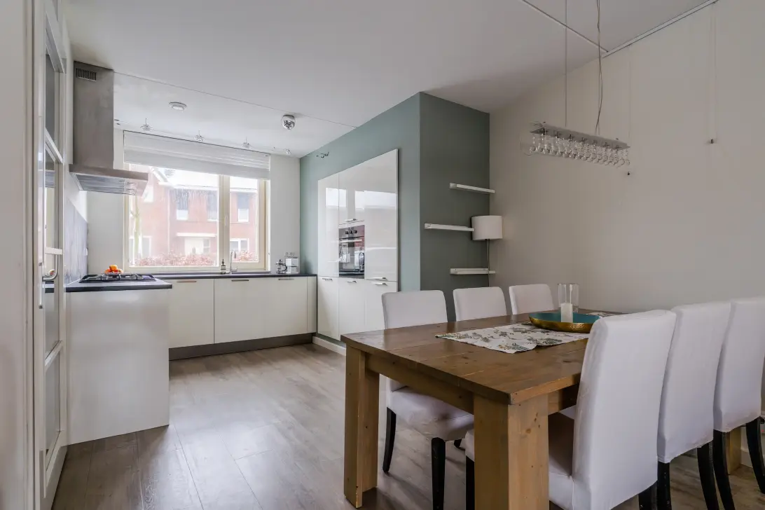 Aan de voorzijde van de woning bevindt zich de open keuken. Deze bestaat uit een keukenblok in hoekopstelling en een kastenwand die in de muur is geïntegreerd. De keuken heeft een strak design met hoogglans witte kastjes en een donker werkblad. Hier tref je de volgende apparatuur aan: vaatwasser, gasfornuis, afzuigkap, oven, koelkast en vriezer.