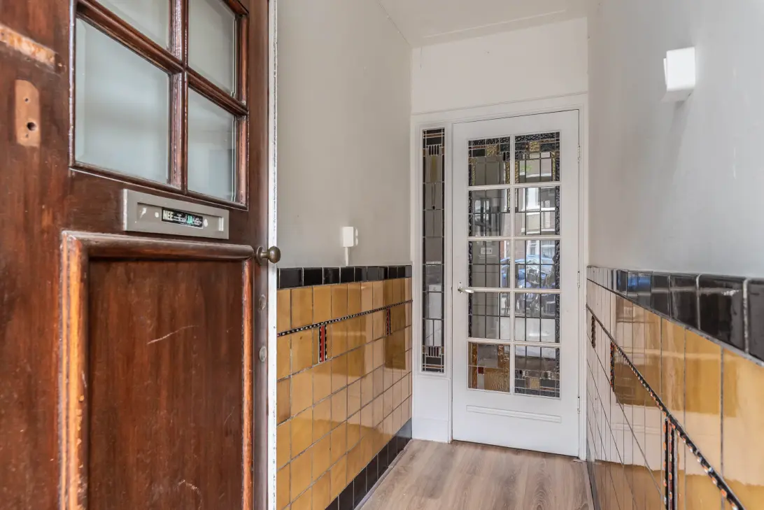 Begane grond: Eigen entree, ruime hal met ruimte voor een garderobe. De ruimte beschikt over karakteristieke details zoals glas in lood ramen en deur. De ruimte is tevens voorzien van kenmerkende in Amsterdamse School wandtegels.