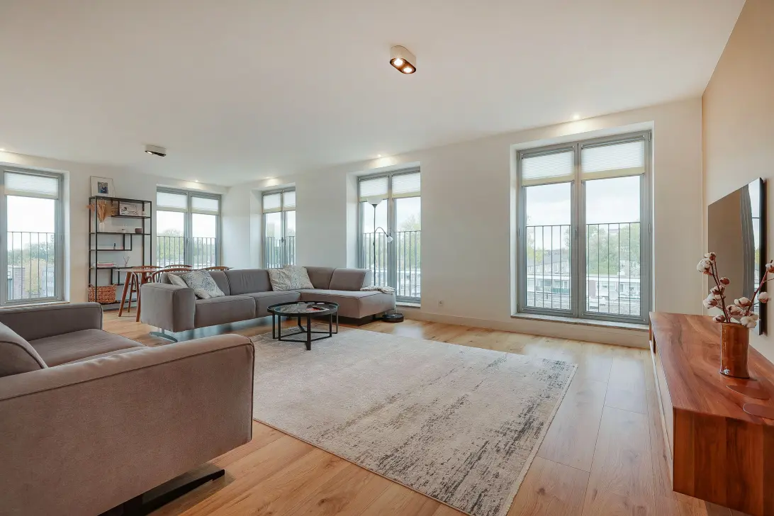 De woonkamer is afgesloten van de keuken door de glazen muur, wat de beide ruimtes een unieke uitstraling geeft en doorkijk naar beide vertrekken. De woonkamer heeft een riante maatvoering en hoekligging met veel daglicht en prachtig uitzicht.