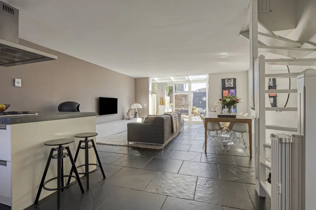 De woning beschikt over een uitgebouwde woonkamer met een kunststof pui aan de achterzijde en schuifdeuren naar de fraai aangelegde achtertuin. De gehele begane grond is voorzien van vloerverwarming, wat zorgt voor extra comfort. Aan de voorzijde bevindt zich de moderne open keuken met kookeiland, compleet uitgevoerd met onder andere een 5-pits gaskookplaat, afzuigkap, combi-oven, koelkast en vaatwasser. Verder vindt u op de begane grond een toilet met fonteintje en een praktische bijkeuken.