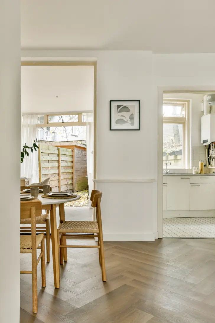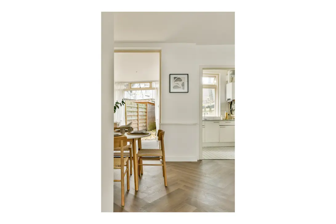 Je komt binnen in de hal met toegangsdeuren naar de woonkamer en de badkamer.
