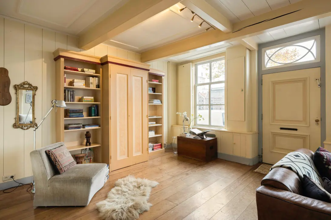 Via de vestibule bereik je de overige vertrekken op de begane grond. De tweede woonkamer ligt aan de zijgevel en vormt een sfeervolle ruimte met eveneens vaste kasten.
