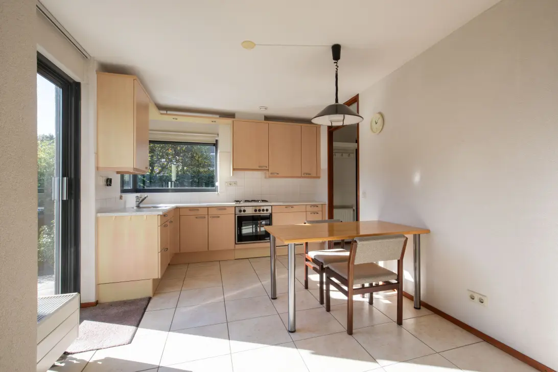 De woonkamer is gesitueerd aan de voorzijde van de woning en valt direct op door de grote raampartijen rondom, wat zorgt voor veel daglicht en een prettige sfeer. De woonkamer en keuken staan in verbinding middels een brede overloop. Aan de achterzijde bevindt zich de keuken, voorzien van een 4-pits gasfornuis, oven, spoelbak, afzuigkap en voldoende kastruimte. Er is ruimte voor een eettafel en via de schuifpui stap je zo de zonnige achtertuin in.