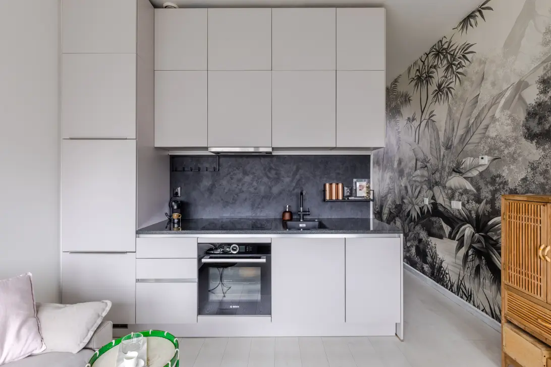 De open keuken is uitgevoerd in een rechte opstelling en heeft een modern design met lichte keukenkastjes en een donker werkblad. De keuken komt uit 2017, maar is in 2025 vernieuwd met een nieuwe kraan, vaatwasser en kookplaat.