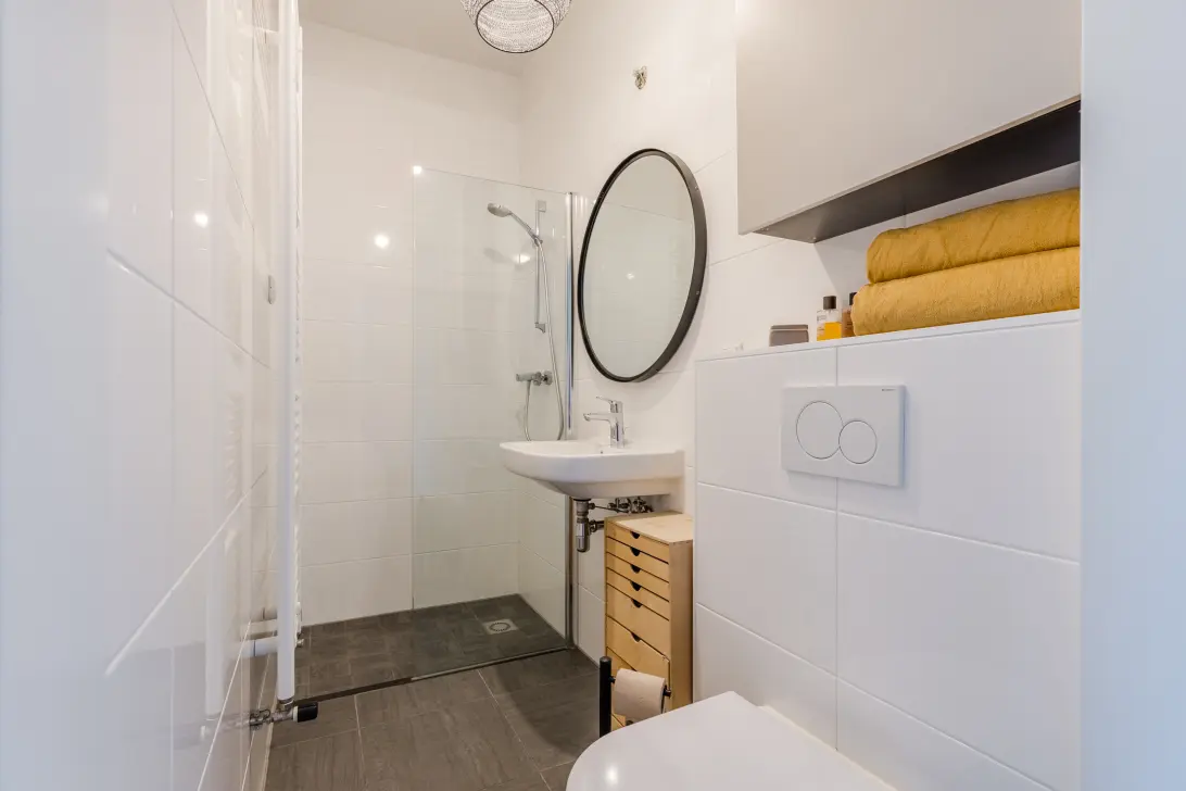 De slaapkamer bevindt zich aan de voorzijde van het appartement. Deze kamer is ruim opgezet en biedt ruimte voor een groot bed en een kast. De badkamer heeft een centrale ligging. Deze ruimte is fraai afgewerkt met grijze vloertegels en witte wandtegels. Hier tref je een zwevend toilet, wastafel, designradiator en inloopdouche aan.