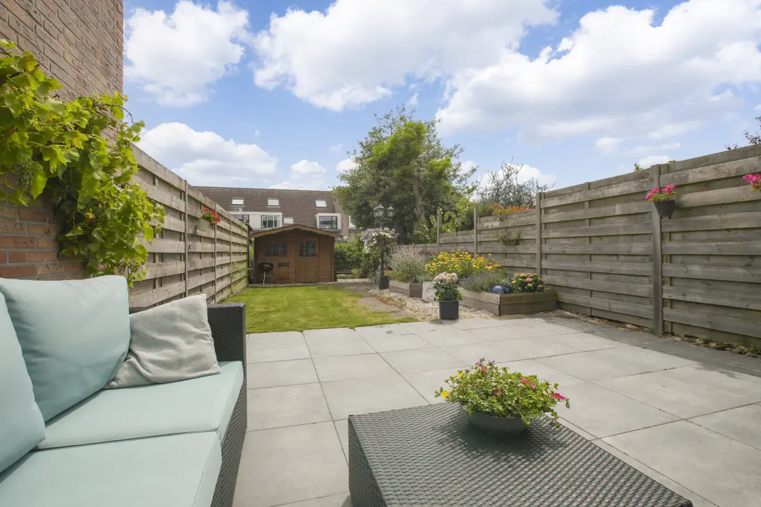De achtertuin is een groot pluspunt: diep, zonnig en gelegen op het zuiden. Achterin staat een houten berging, handig voor fietsen of tuinspullen. Aan de voorzijde heb je een eigen carport, zodat je altijd voor de deur kunt parkeren.