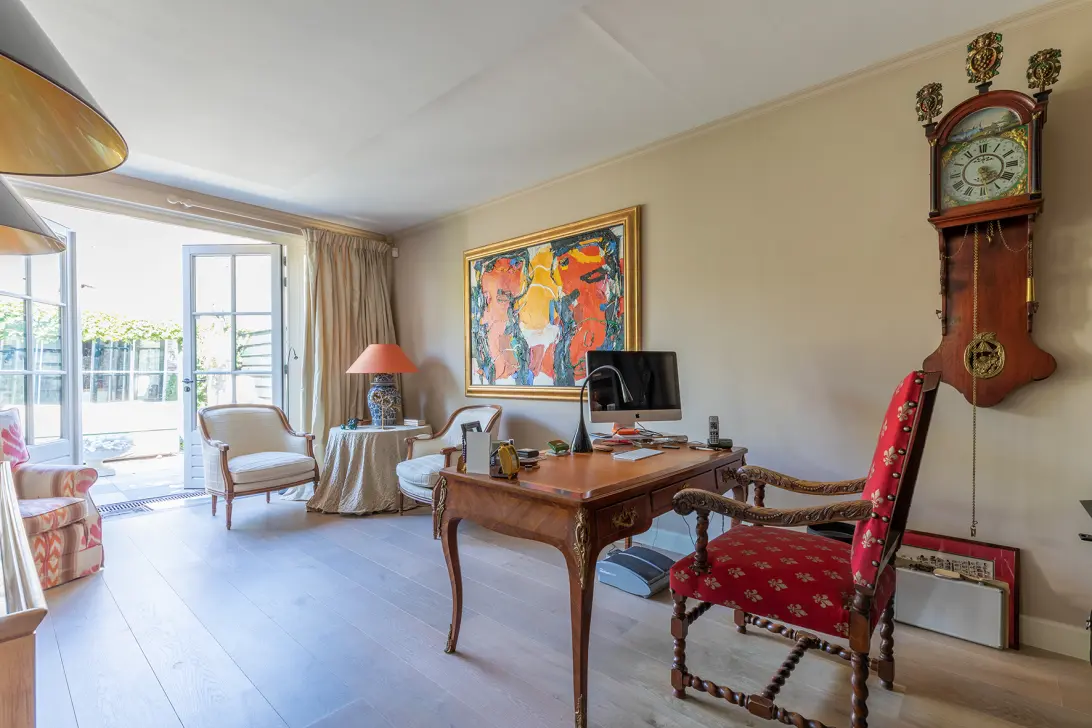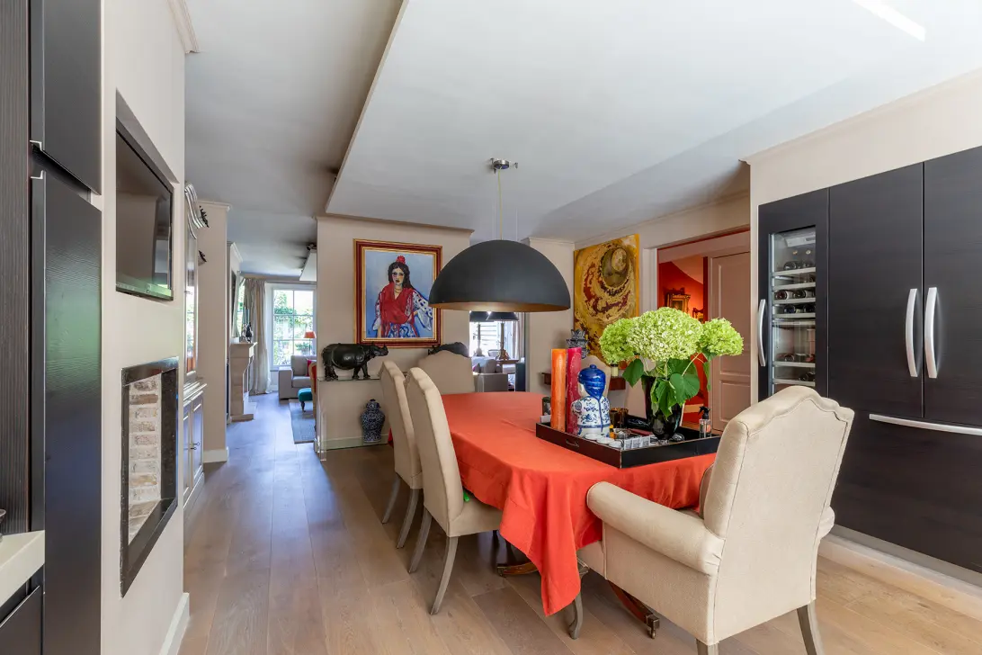 Royale entree met gastentoilet, alarminstallatie en op maat gemaakte garderobe kasten. De gehele parterre is afgewerkt met massief houten vloerdelen. Voor de afwerking is gebruik gemaakt van hoogwaardige materialen. Via een schuifdeur komt u in de royale woon/eetkeuken voorzien van diverse Miele inbouwapparatuur; oven, stoomoven, 2 warmhoudlades, inductiekookplaat met een gasbrander, wijnkoelkast, dubbele koelkast, afwasautomaat en gashaard. Aansluitend is de ruime living gescheiden middels een room-divider. De lichte living beschikt over een sfeervolle gashaard met op maat gemaakte kasten. Een aparte study met een boekenkabinet. De dubbele openslaande deuren geven toegang tot de zonnige terras/ koele binnentuin met ligging op het noorden en veel privacy.