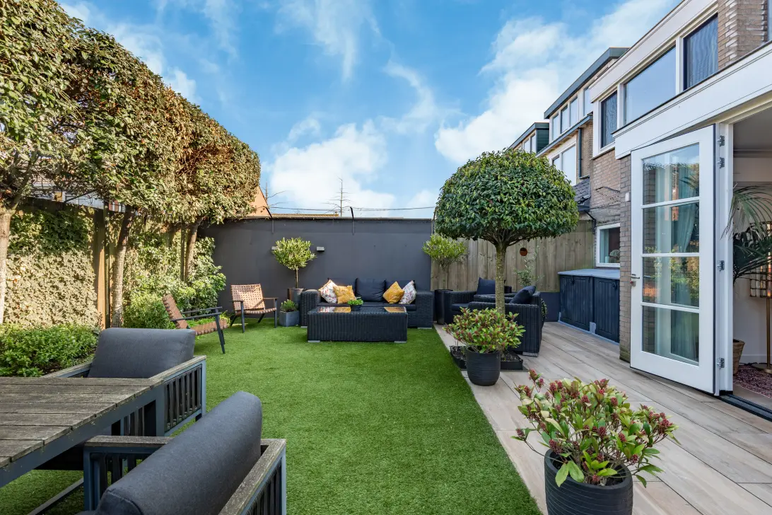 Middels de openslaande deuren in de woonkamer bereikt u de achtertuin. De tuin is met zorg ontworpen en onderhouden en beschikt over meerdere fijne terrassen. Daarnaast is de tuin voorzien van verlichting, een praktische achterom, een warmwaterkraan en een gewone buitenkraan. In de middag geniet u hier van de zon.