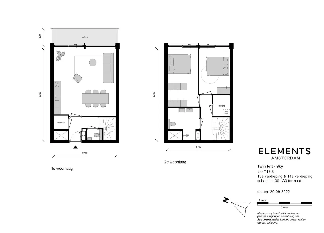 Op de dertiende verdieping van Elements wordt Sky Twin Loft T13.3 gerealiseerd, met een woonoppervlak van circa 91 m² en een balkon van circa 9 m². De woning wordt betreden via een ruime hal met toegang tot het gastentoilet en de trap naar de tweede woonlaag. De lichte living biedt uitzicht op het Bella Vista Park en heeft een directe verbinding met het balkon, waar de ochtendzon en het uitzicht richting de Amstel samenkomen. Op de bovenste woonlaag bevinden zich twee slaapkamers, beide met royale schuiframen die zorgen voor veel licht en een open verbinding met buiten. Daarnaast is er een berging aanwezig. De badkamer wordt uitgevoerd met grote zandkleurige matte tegels in combinatie met deels strak gestucte wanden, en voorzien van een inloopdouche, dubbele wastafel en tweede toilet. De keuken is ontworpen door Leicht Kitchens en wordt uitgerust met hoogwaardige apparatuur, waaronder een Quooker-kraan en een inductiekookplaat met geïntegreerde afzuiging. Het ontwerp kan worden aangepast naar persoonlijke smaak, met ruimte voor materiaal- en kleurkeuzes en slimme indelingen.