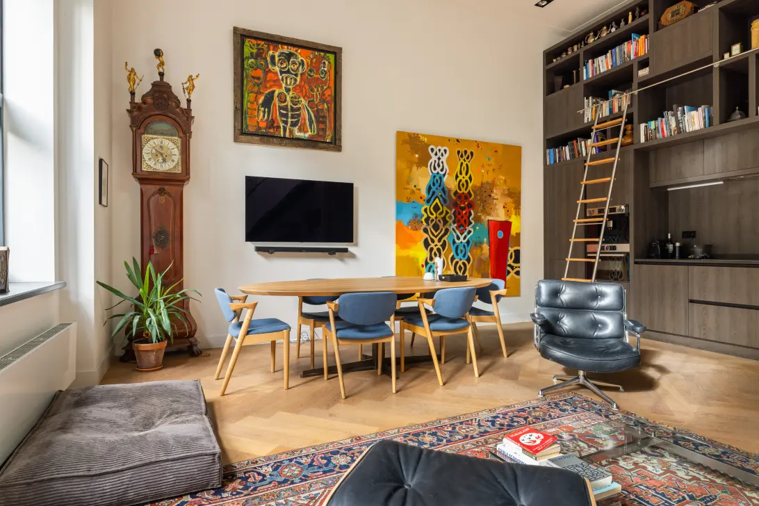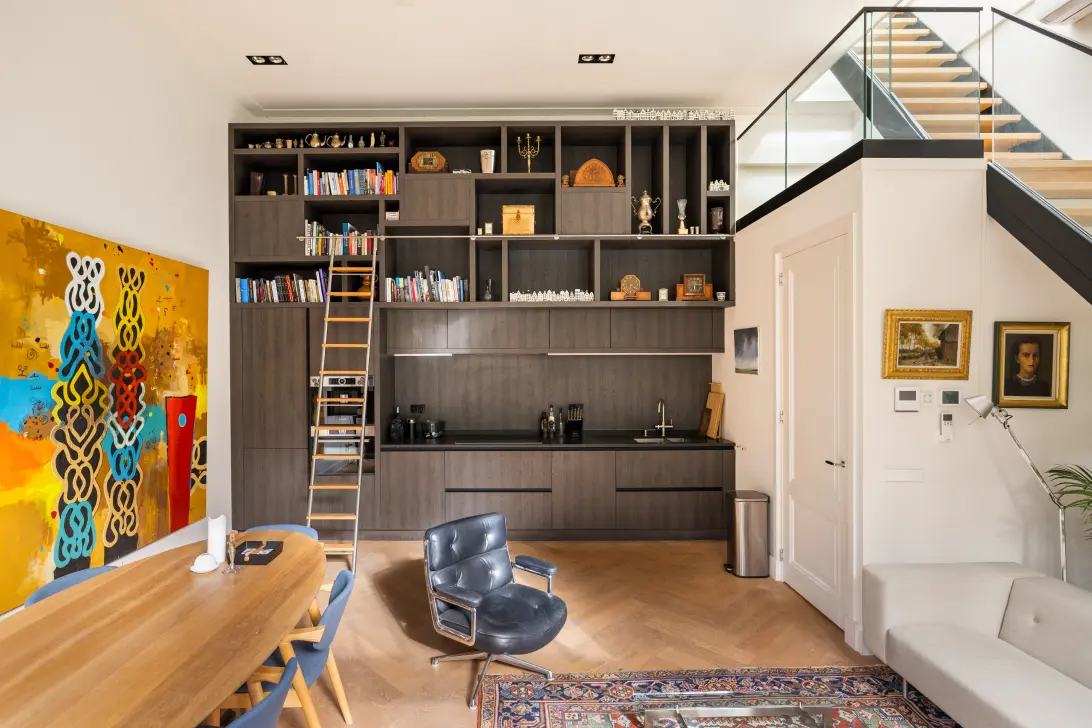 De woonkamer is indrukwekkend dankzij de 4,20 meter hoge plafonds, grote raampartijen en een fraaie lichtinval. Er is volop ruimte voor een comfortabele zithoek én royale eettafel. De op maat gemaakte open keuken is uitgerust met hoogwaardige inbouwapparatuur, waaronder een 5-pits inductiekookplaat, oven, vaatwasser én ingebouwd koffiezetapparaat.