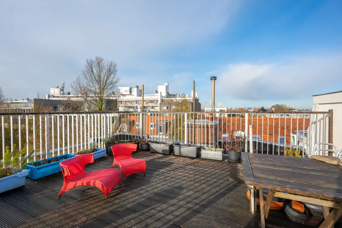 Het dakterras zelf is een prachtig pluspunt. Een royale buitenruimte op hoogte, met uitzicht richting het Vondelpark en volop plek om te genieten van zon en rust.