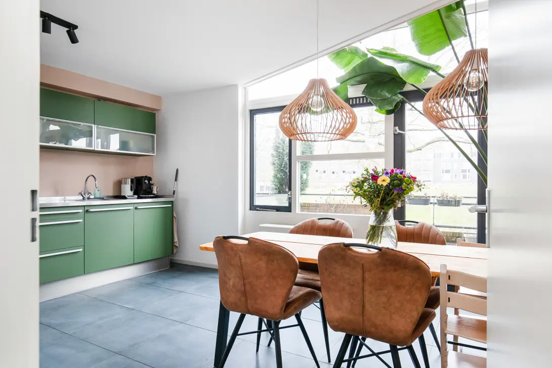 Level 1: de royale woonkeuken is uitgevoerd met veel bergruimte, een rvs werkblad en diverse inbouwapparatuur, te weten: 5-pits gasfornuis, afzuigkap, combi-oven en vaatwasser. De keuken is heerlijk licht door de hoge ramen. Vanuit de keuken komt u op het terras aan de achterzijde van de woning met zicht op het Zomerpark.