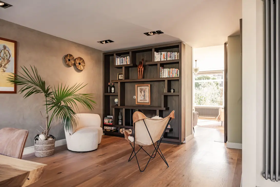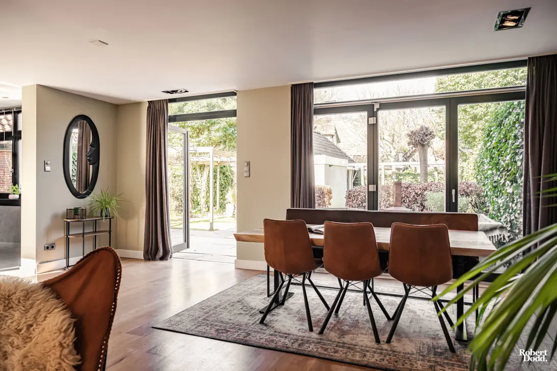 De stijlvolle woonkamer is opgedeeld in een voor- en achterkamer, gescheiden door een op maat gemaakte vakkenkast, een houten taatsdeur en doorlopende houten parketvloer. De voorkamer met erker is heerlijk licht, een fijne plek voor een kop koffie in de ochtendzon met uitzicht op de groene voortuin. De haag zorgt voor veel privacy en er is tevens een mooi uitzicht op o.a. de hortensia's, appel- en olijfboom. De achterkamer nodigt uit tot lange avonden tafelen en lezen in de separate zithoek bij de open haard. De harmonicadeuren zorgen voor een prachtige overgang naar de tuin en geven binnen en buiten een natuurlijke verbinding. De woonkeuken met aan beide kanten ramen is het kloppende hart van het huis. Licht, ruim en ontworpen om samen te komen. Het ruime kookeiland leent zich perfect voor ontbijtjes met het gezin, gezellige borrels en kinderen om huiswerk te maken. Heerlijk licht en met zicht op zowel de voor- als achtertuin met de blauwe regen en de witte hortensia's op de achtergrond is dit een uitnodigende ruimte.