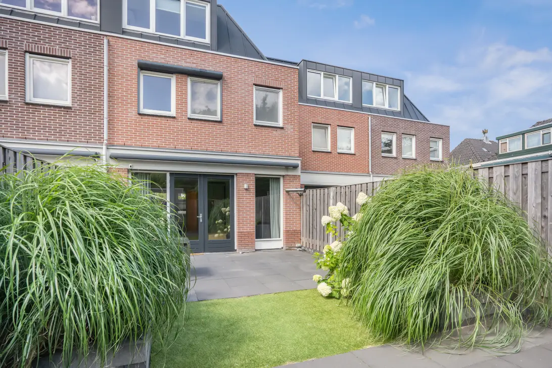 The sunny rear garden, facing south, provides plenty of space to relax. With the large luxury Verano sunshade, you can choose between sun and shade at any time of the day. The garden is largely paved, designed for low maintenance, and features artificial grass and a spacious storage room.