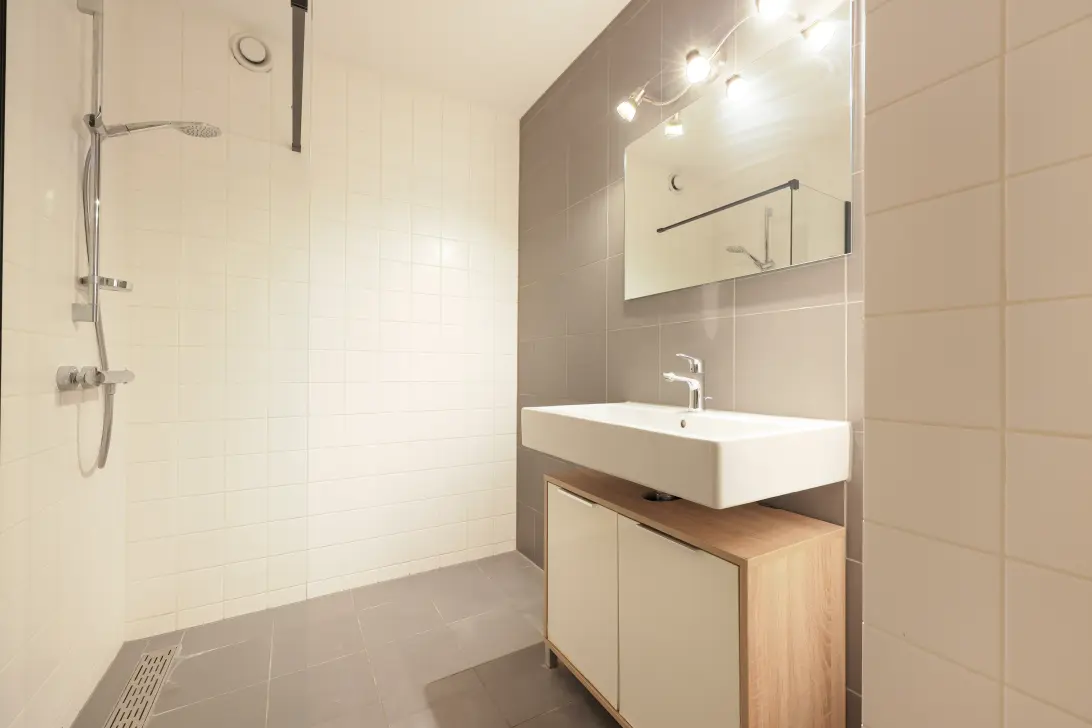 Het appartement beschikt over een ruime slaapkamer. De badkamer is verzorgd uitgevoerd en voorzien van een inloopdouche, wastafelmeubel en aansluiting voor de wasmachine. Daarnaast is er een separaat toilet met fonteintje en zijn er twee praktische bergkasten in de hal aanwezig.