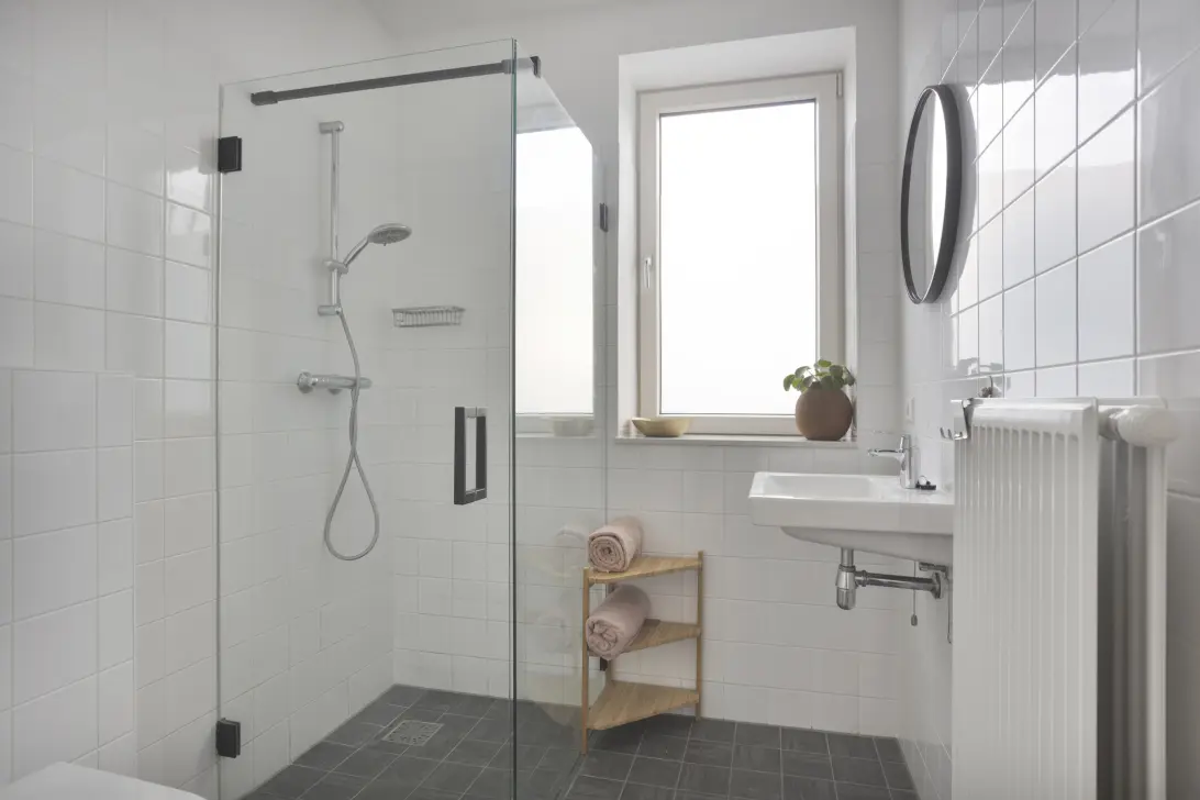 De slaapkamer, net als de woonkamer en keuken, is gelegen aan de rustige kant van het gebouw. Zoals te zien is op de foto’s, biedt de kamer voldoende ruimte voor een tweepersoonsbed en een royale garderobekast. In de aangrenzende badkamer vind je een inloopdouche, wandcloset en een wastafel met spiegelkast.