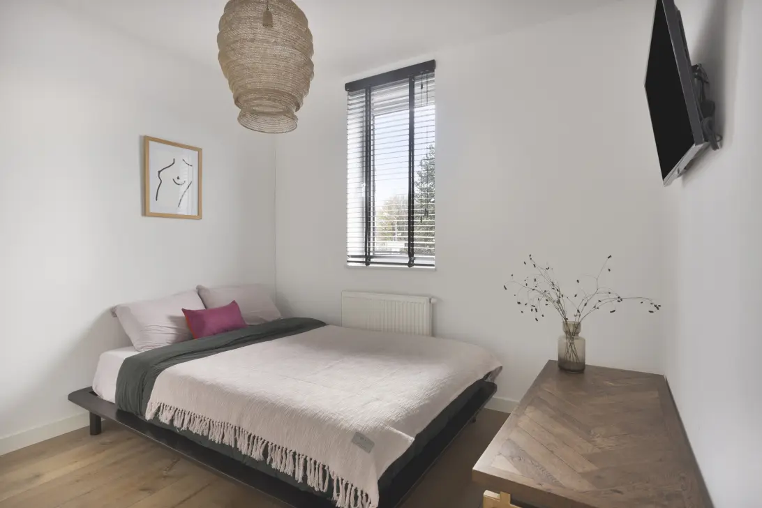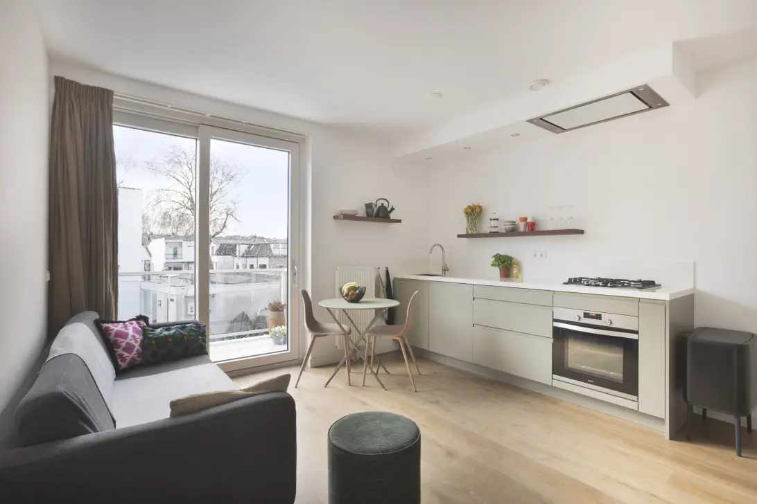 Appartement: Bij binnenkomst stap je direct in de woonkamer, die naadloos overgaat in de keuken. De ruimte, voorzien van een moderne houten vloer van Zaan Bever en lichte muren, oogt ruim en gezellig. Dankzij de slimme indeling is er voldoende ruimte voor een bank met salontafel, een tv en een eettafel.