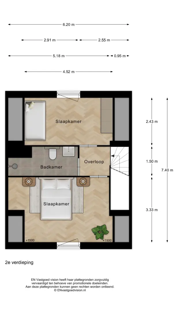Boven, op de derde woonlaag, zijn nog twee riante slaapkamers, met daartussen een tweede badkamer met inloopdouche, wastafel en tweede toilet.