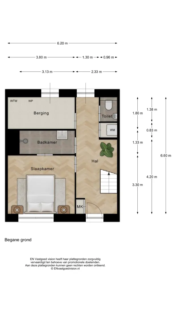 Begane grond: entree via Zuideinde. Hal met meterkast. Trapopgang. Slaap- annex werkkamer met eigen badkamer. Geheel betegeld en standaard voorzien van inloopdouche en wastafel. Uitbreiding van het sanitairpakket is een kopersoptie. Facilitaire ruimte met aansluitingen wasmachine en -droger. Geheel betegelde toiletruimte met wandcloset en fontein. Achterdeur naar dubbele carport met twee parkeerplaatsen op eigen erf. Aparte loopdeur naar inpandige berging annex technische ruimte.