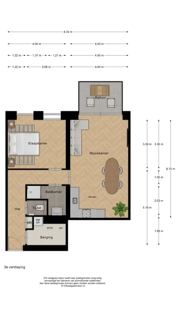 3e Etage: gemeenschappelijke overloop. Entree appartement. Gang. Berging met installaties WTW, mechanische ventilatie en boiler, aansluitingen wasmachine en -droger. Meterkast. Geheel betegelde toiletruimte met wandcloset en fontein. Eveneens betegelde badkamer met inloopdouche en wastafel. Uitbreiding van het sanitairpakket is een kopersoptie. Slaapkamer (ruim 13 m2) met gevelhoge draairaampartij en direct zicht op de Zaan.