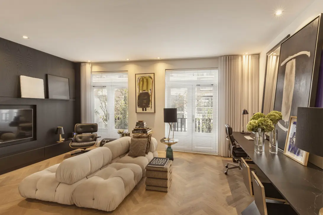 De riante tuingerichte woonkamer aan de achterzijde is dankzij de grote raampartijen en openslaande deuren heerlijk licht. De wanden zijn strak gestuct en op de vloer liggen plavuizen met vloerverwarming.