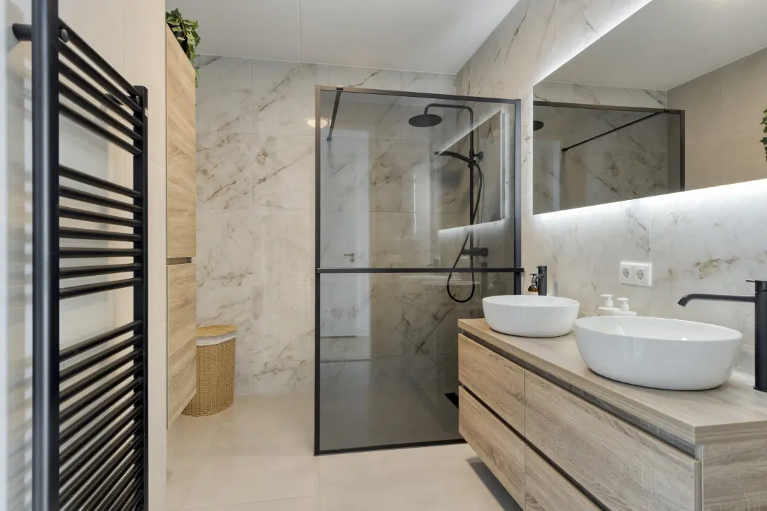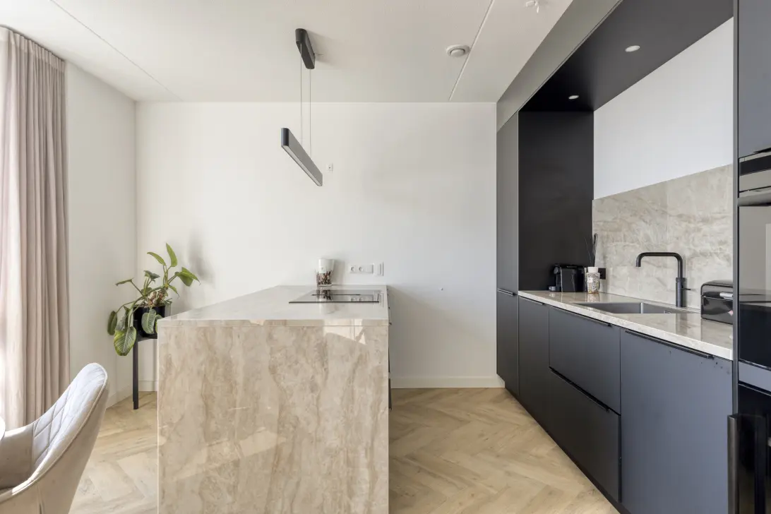 De open keuken met kookeiland vormt het hart van de woning en is uitgevoerd in een hoogwaardige afwerking. De keuken is volledig uitgerust met inbouwapparatuur van Bosch, waaronder een Quooker (kokendwaterkraan) en een wijnkoeler. Het stijlvolle Dekton werkblad maakt het geheel compleet en is bovendien kras-, vlek- en hittebestendig.
