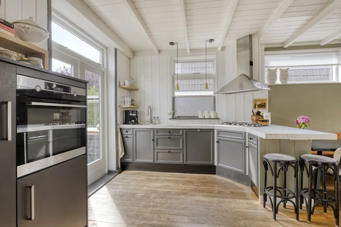 De landelijke keuken grenst aan de achterzijde van de living en biedt een heerlijke werkplaats voor alle hobbykoks en bedreven bakkers! De keuken is afgewerkt met een licht werkblad en bevat een gaskookplaat, afzuigkap, vaatwasser, koelkast en oven. Hier vind je alles wat je nodig hebt voor het creëren van de lekkerste gerechten. De praktische opstelling biedt tevens de nodige werk- en bergruimte.