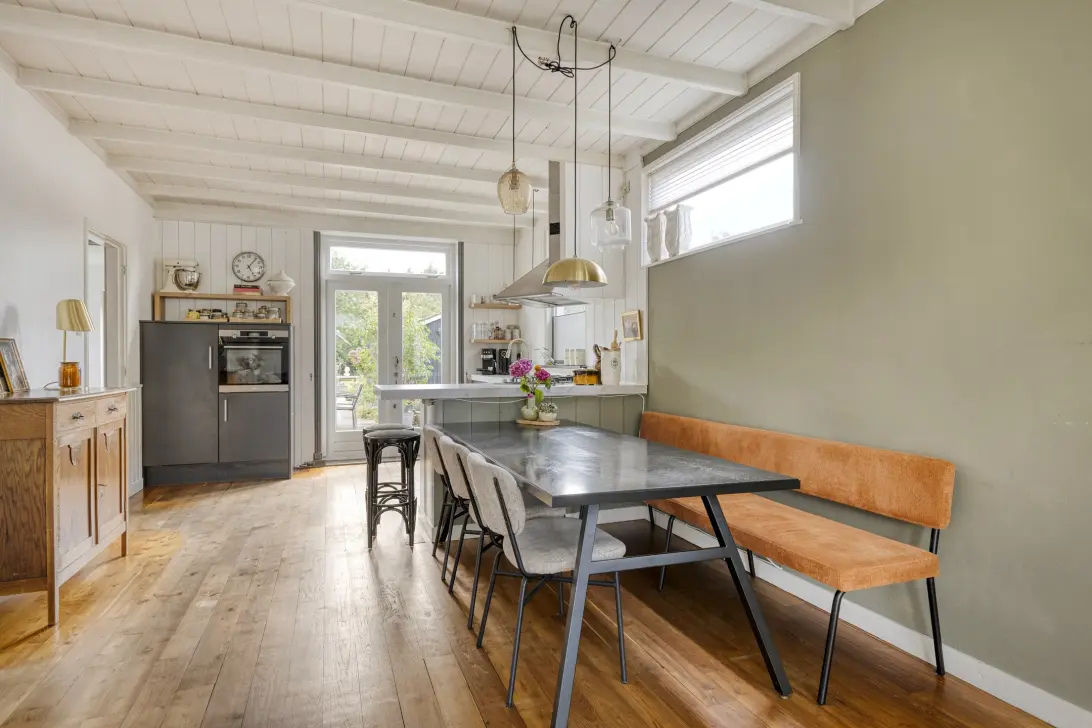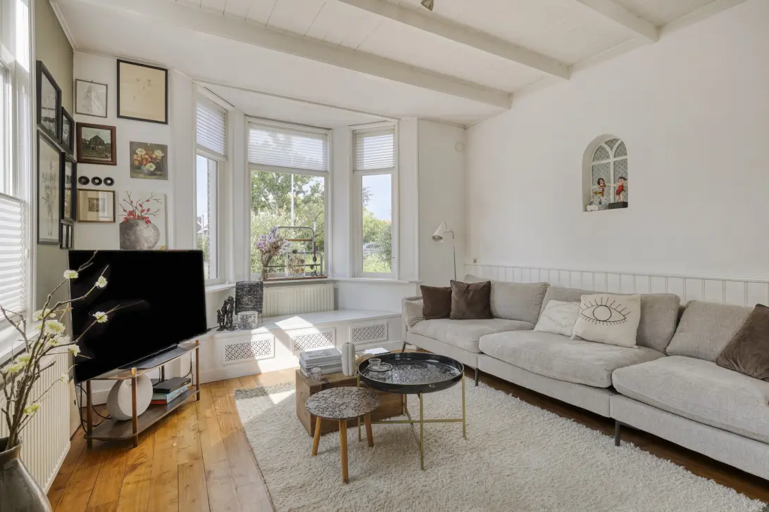 Stap binnen in de ruime woonkamer met karakteristieke erker. Hier vind je een oase van licht dankzij de vele ramen aan de voorzijde en de openslaande tuindeuren aan de achterzijde. De prachtige zichtbare balken geven de ruimte bovendien extra charme en een authentieke uitstraling. De kamer is daarbij ook nog eens van goed formaat, waardoor je als gezin alle ruimte hebt om gezellig samen te komen. De afwerking is neutraal met een houtenvloer en lichte geschilderde wanden, wat de kamer een fijne basis geeft voor je eigen stijl. Met een grote bank vol kussens en plaids en een lange eettafel is dit dé plek waar geleefd wordt.
