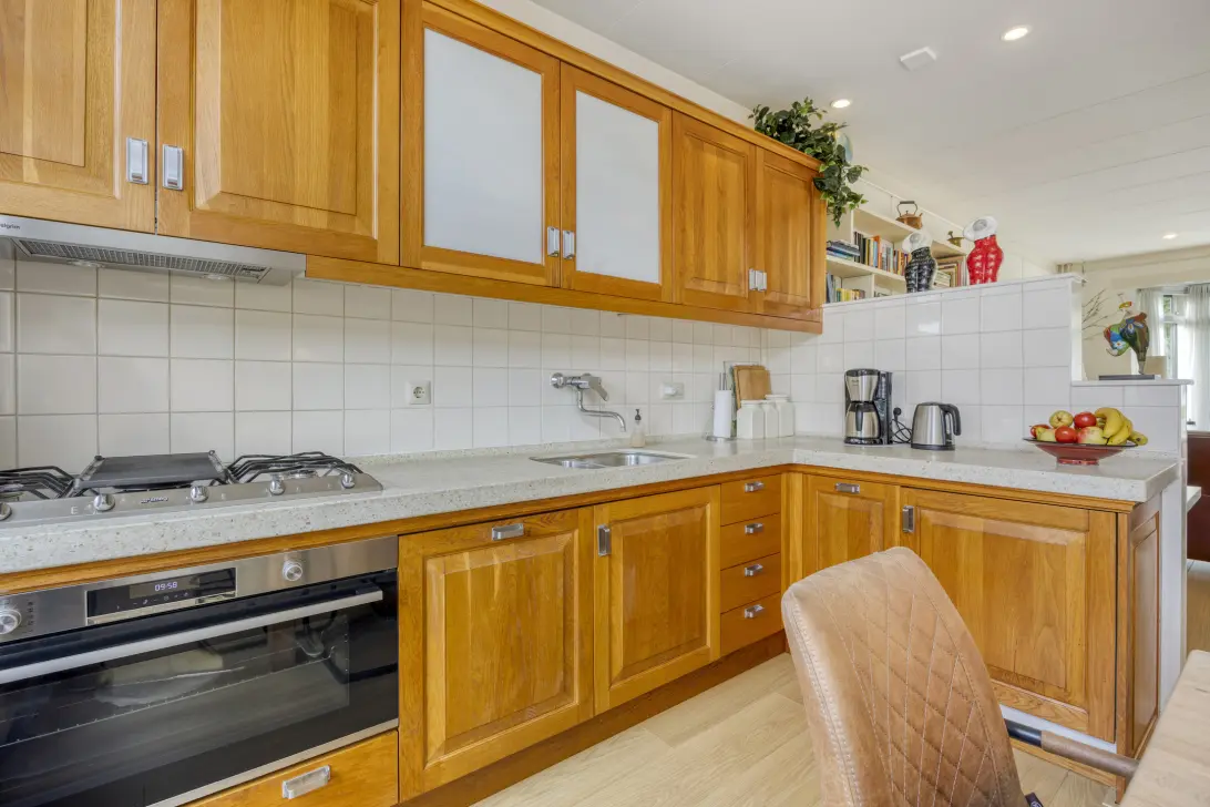 De woonkamer loopt naadloos over in de keuken, die is uitgerust met moderne inbouwapparatuur. Hier vind je onder meer een gaskookplaat, afzuigkap, brede oven, koelkast en vaatwasser – alles wat je nodig hebt om comfortabel te koken.