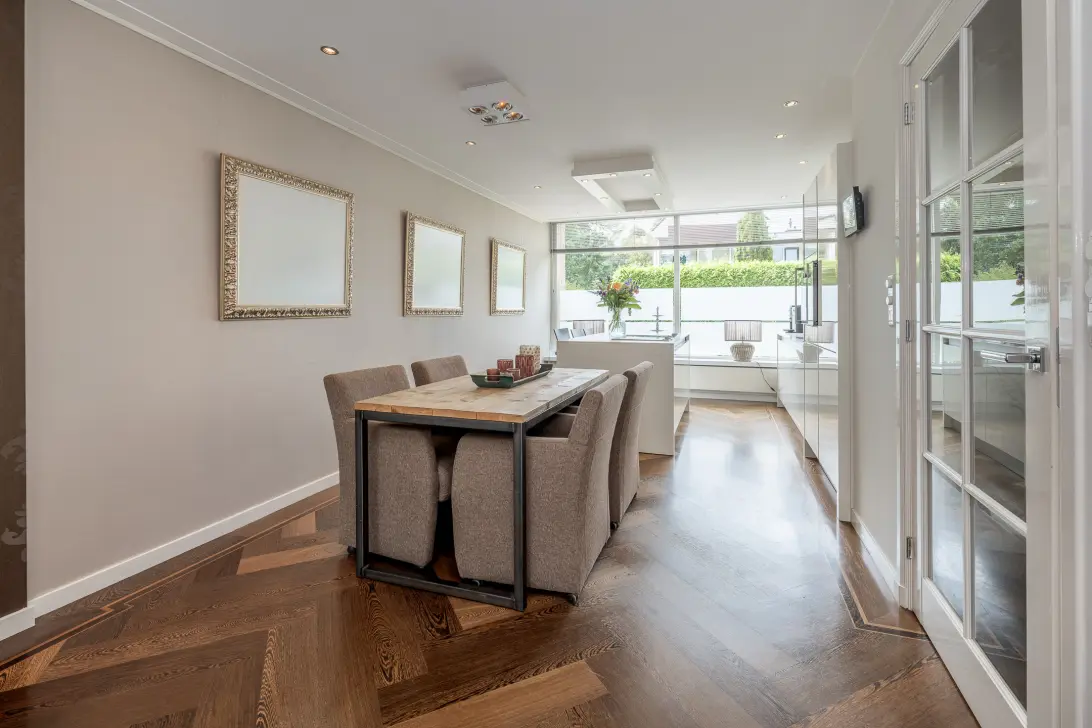 Entree /vestibule met garderobe, ruime hal met modern toilet, trapkast en toegang tot de royale uitgebouwde woon-/eetkamer. Dankzij de openslaande tuindeuren en grote raampartijen geniet je hier van een zee aan licht. De moderne woonkeuken is een echte eyecatcher: compleet met kookeiland, barretje en luxe inbouwapparatuur – ideaal voor een snelle maaltijd of om samen even de dag door te nemen tijdens het koken. De prachtige visgraat parketvloer maakt het geheel compleet.