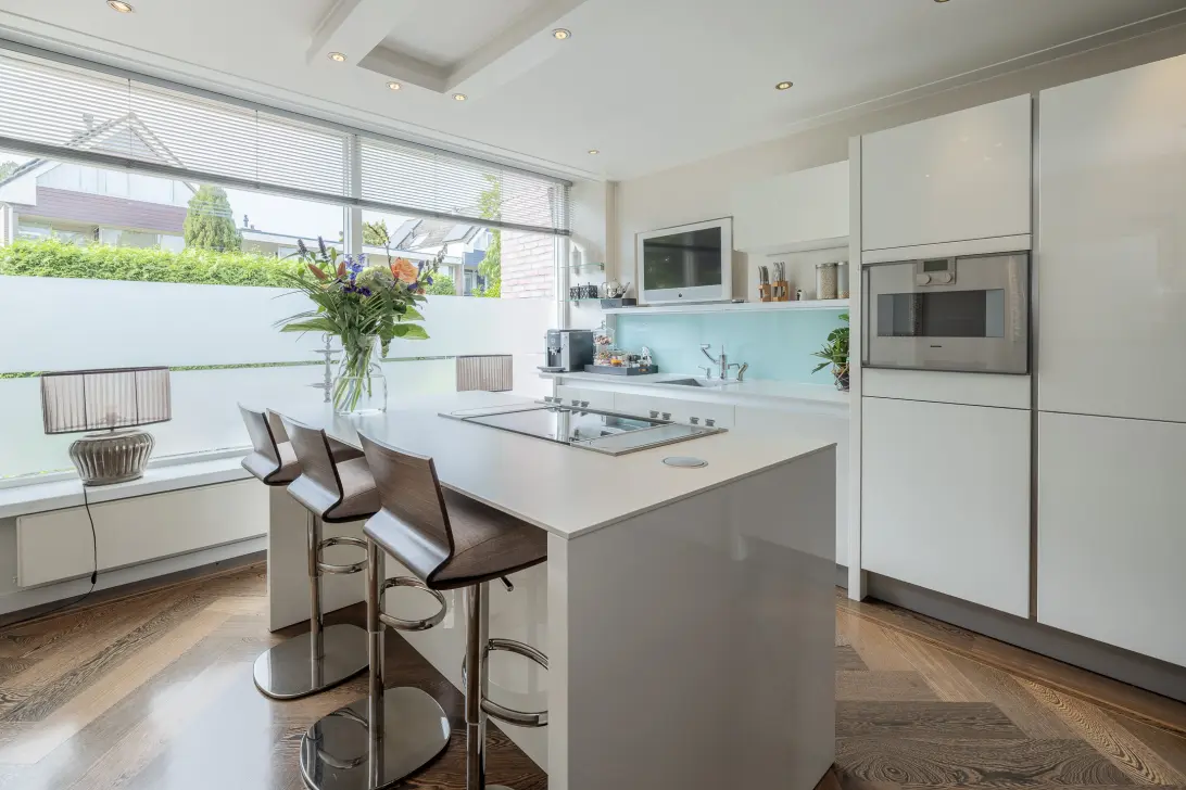 • Luxe woonkeuken met kookeiland en gelegenheid om aan te schuiven op een barkruk;