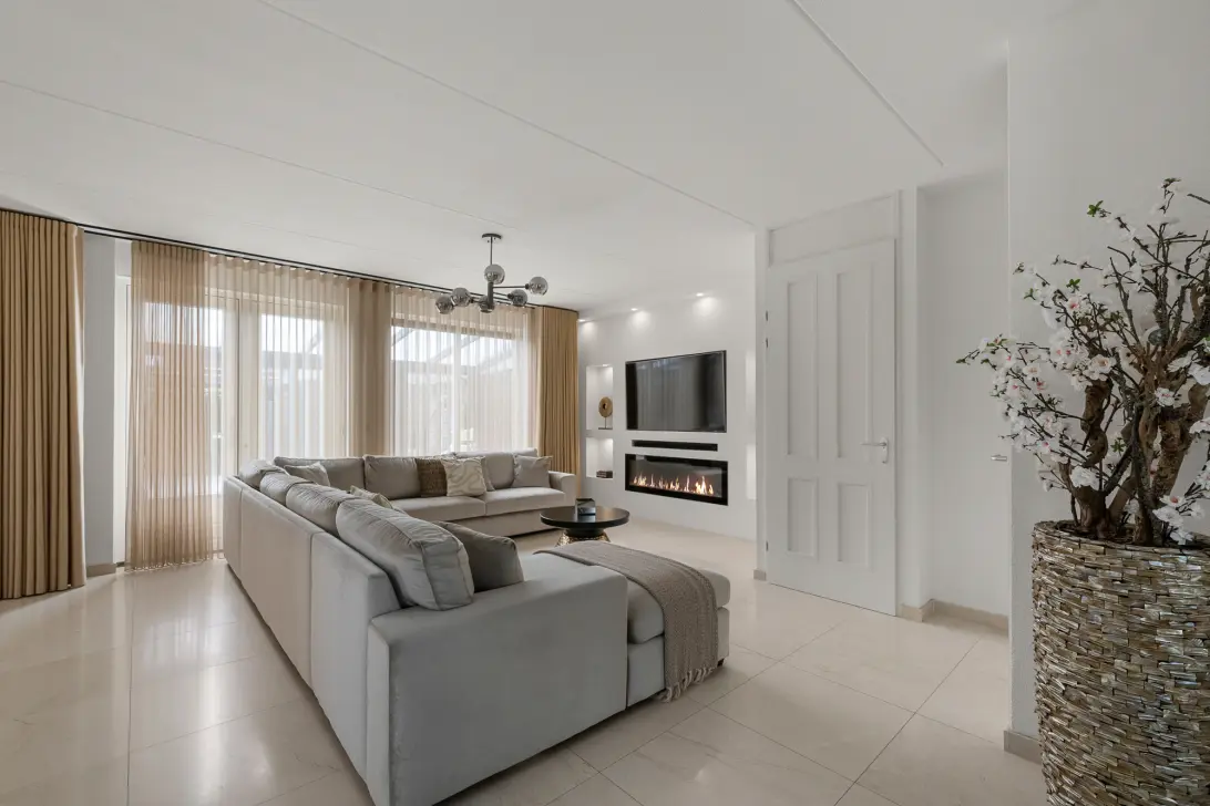 Op de begane grond vind je een riante living met tegelvloer en vloerverwarming. Het zitgedeelte is uitgerust met een moderne cinewall met elektrische haard. Aan de voorzijde ligt de ruime open keuken, compleet met alle benodigde inbouwapparatuur en vernieuwd aanrechtblad. Daarnaast is er een gezellige eethoek waar je moeiteloos een eettafel kwijt kunt. Sfeervolle plafondspots zorgen voor aangenaam licht. Dankzij de hoekligging en de vele raampartijen geniet je hier de hele dag van natuurlijke lichtinval.