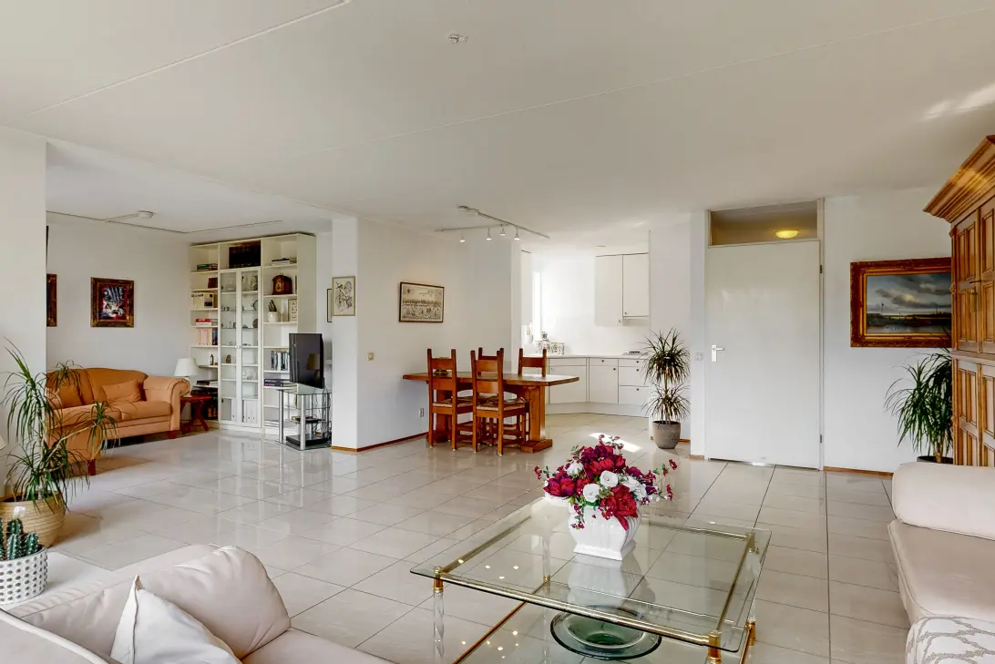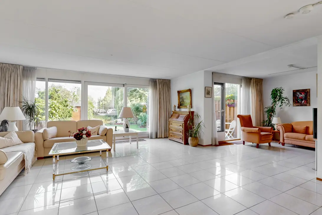 De woonkamer is lekker licht dankzij de grote ramen, schuifpui en openslaande deur naar de tuin. De open keuken ligt centraal in de woning waardoor contact met overige woonruimtes en heeft veel kastruimte en alle apparatuur die u nodig heeft, zoals een vaatwasser, oven, magnetron en koel/vriescombi.